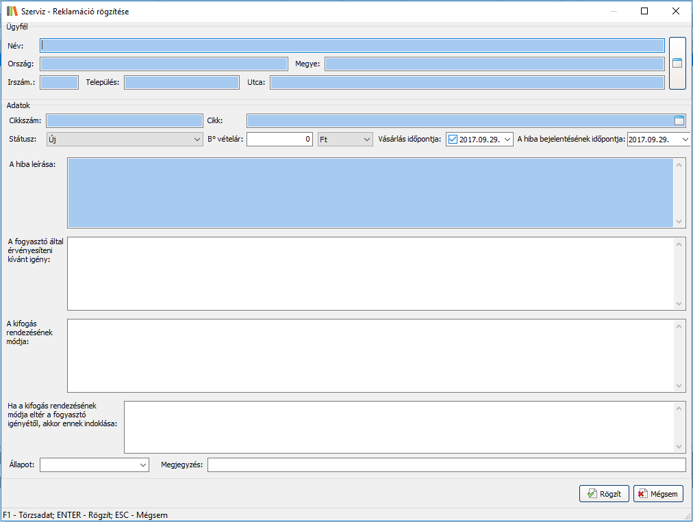 Fontos! A kötelezően megadandó mezők a parméterek beállításaitól függően változhatnak! Lásd a Paraméterek - Reklamáció fejezetben.