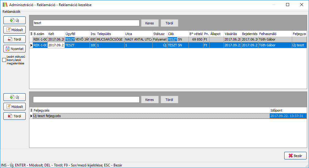 Válasszon ki a fenti listából egy reklamációt, majd a feljegyzések résznél használja az