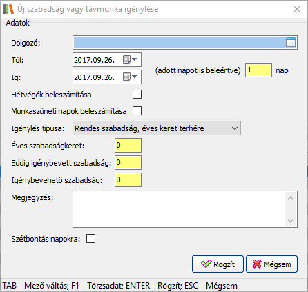 (Új): Új szabadság vagy távmunka igénylés rögzítése. -