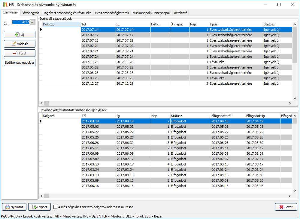 Elérése: HR -> Szabadság és távmunka nyilvántartás -> Igénylések (fül)