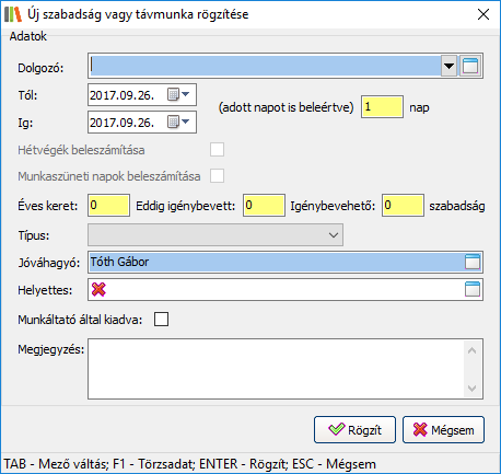 Ezen a felületen rögzíthető egy kiválasztott dolgozó részére bármilyen típusú szabadság vagy távmunka. Így adminisztrálhatóak az esetleges pót-, beteg- és egyéb szabadságok, illetve ha szükséges, az évi rendes szabadságok is kezelhetők itt (pl. munkáltató által kiadott rendes szabadság).