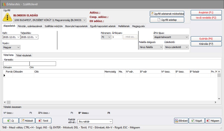 - Ha megadott minden szükséges adatot a fenti fülek segítségével, következhet a tételek hozzáadása a bizonylathoz. Előfordulhat, hogy már szerepel(nek) tétel(ek) a tétel listában, noha még nem adott manuálisan hozzá új tételt, például, ha előzménybizonylatot használt fel.