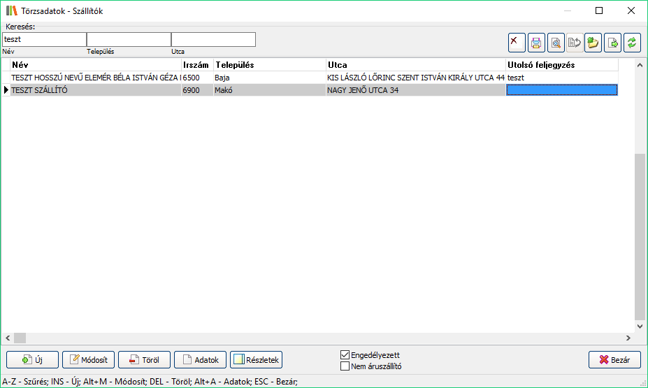 Elérése: Törzsadatok -> Szállító törzs