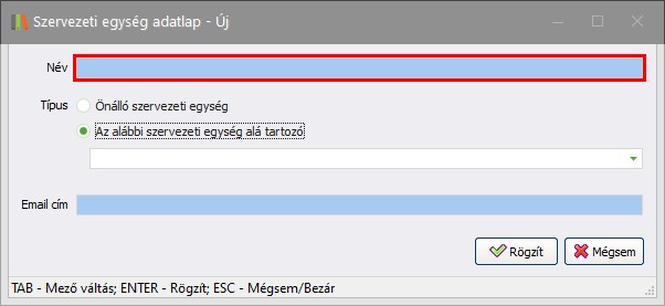 Megadható, hogy a szervezeti egység önállóként kerül rögzítésre a rendszerbe, vagy egy másik, már meglévő szervezeti egység alá fog tartozni. Amennyiben egy másik szervezeti egység alá tartozót kívánunk létrehozni, úgy a megjelenő választó listából válasszunk egyet a már meglévők közül. A szervezeti egységhez adhat meg e-mail címet. Az e-mail címnek szerepe van a projekt modulban, a projekt módosításkor küldendő e-mail listába bekerül a szervezeti egység e-mail címe.