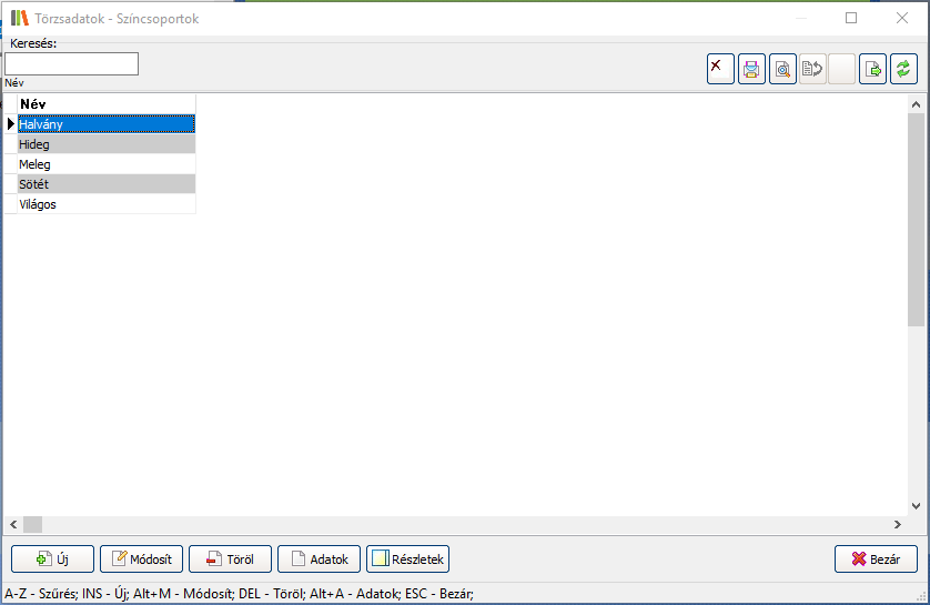 Elérése: Törzsadatok -> Egyéb -> Színcsoport törzs