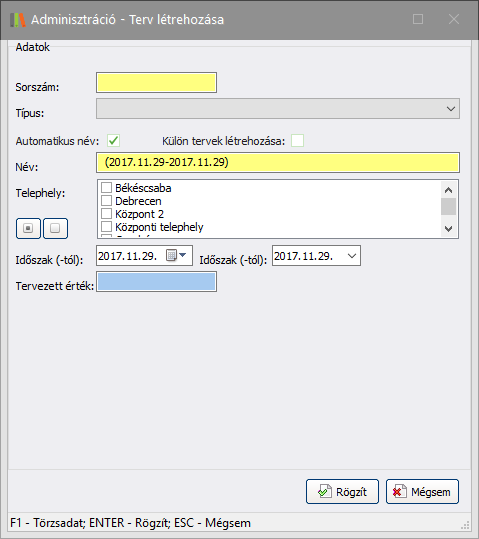 Opcionálisan kiválaszthatja, hogy melyik telephelyre/jogcímre vonatkozik a terv. Ha ez nincs megadva, úgy minden telephelyre/jogcímre együttesen fog vonatkozni a terv. A külön tervek létrehozása jelölő használatával a rendszer mentéskor telephelyenként külön terveket hoz létre, ellenkező esetben egy terv jön majd létre, amely minden kijelölt telephelyre vonatkozik. Szükséges továbbá a terv időszakának megadása. Árrés típusú tervnél a tervezett értéket százalékban adhatja meg, forgalom, illetve jogcím esetében nettó Ft-ban, weblap látogatás esetében látogatóban, míg új kapcsolat felvétel típus esetében db-ban. A mennyiségi egységet a program a típus kiválasztásától függően automatikusan állítja be.