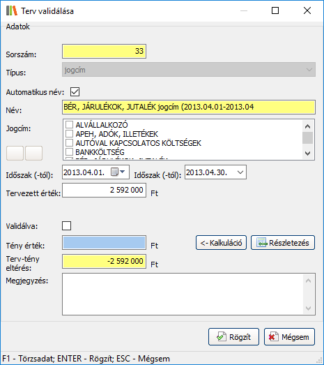 (Kalkuláció) gombra. Ekkor a program a rendelkezésre álló adatok alapján kiszámítja a Tény érték és a Terv-tény eltérés mezőket. A bizonylatok részletes listáját (melyek alapján a program a tény értéket számolta) a
