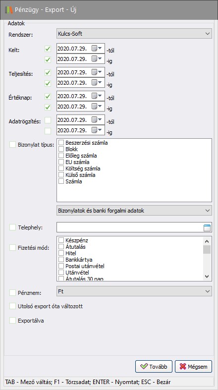 Fontos! A rendszer a legtöbb szűrési feltételt automatikusan beállítja az export során!
