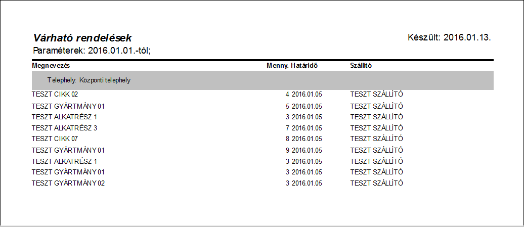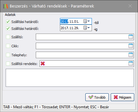 A lekérdezés tárgya egy paraméterező ablakban adható meg. A lekérdezés használható egy vagy több paraméterrel, illetve paraméter nélkül is. Utóbbi esetben az összes, még fel nem dolgozott Szállítói rendelés tételét visszaadja a program, köztük akár a már évek óta nem aktuális, de ki nem törölteket is.