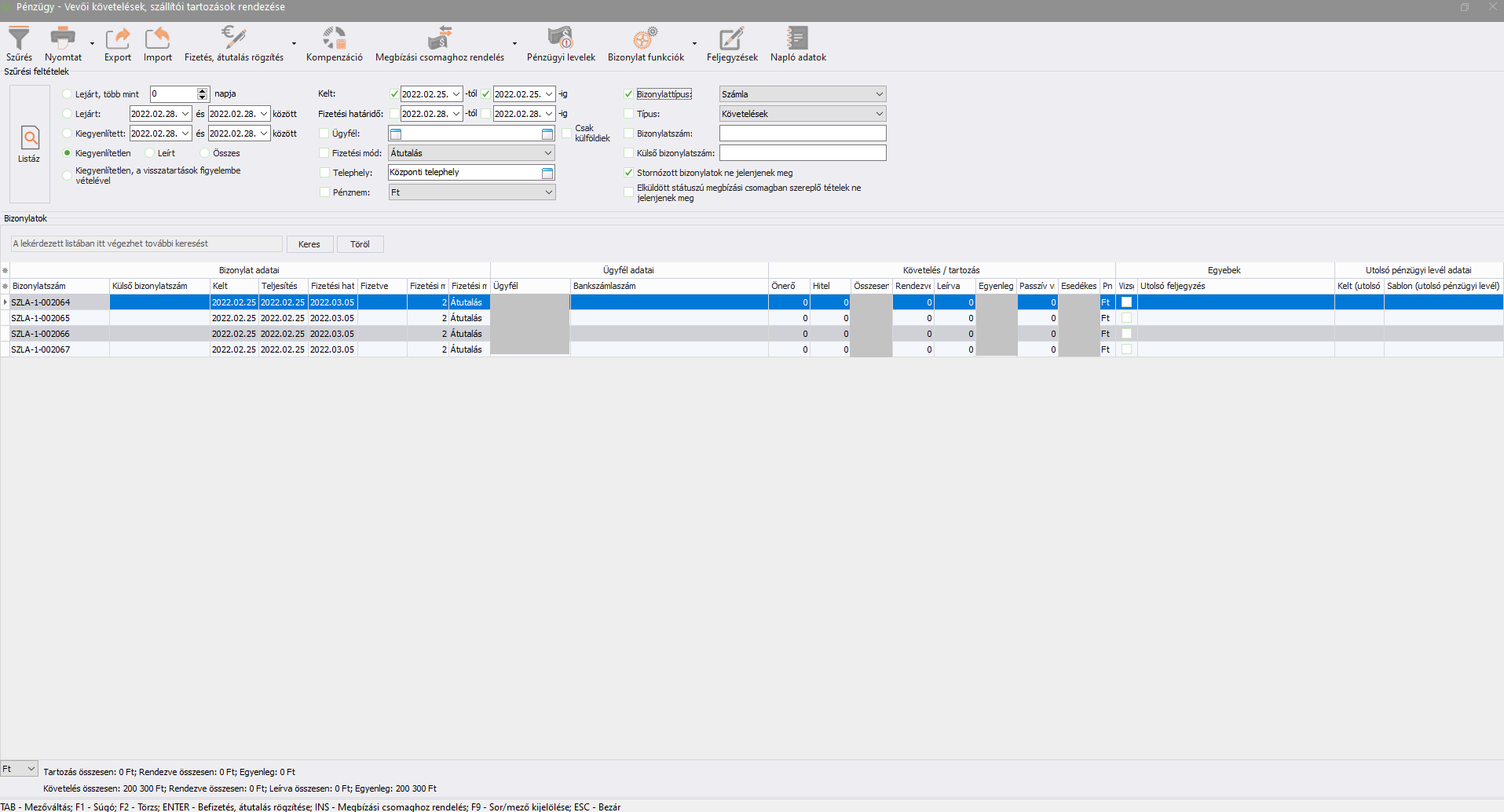 Fontos! A listában alapértelmezésként kizárólag a Kiegyenlítetlen státuszú bizonylatok jelennek meg a szűrőfeltételek miatt! A szűrési feltételek módosításával frissülő lista betöltése a listázandó sorok mennyiségétől függően akár percekig is eltarthat.