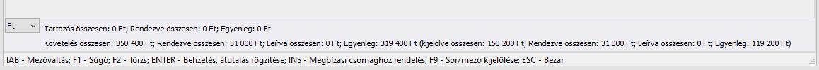 A listában megjelenő bizonylatokat a rendszer pénznemenként külön-külön összesíti a lista alatt található összesítő adatok esetében. A listában kijelölt bizonylatok - többes kijelölés esetén - összesítése az ablak alsó részében kerül kimutatásra a zárójeles részben.