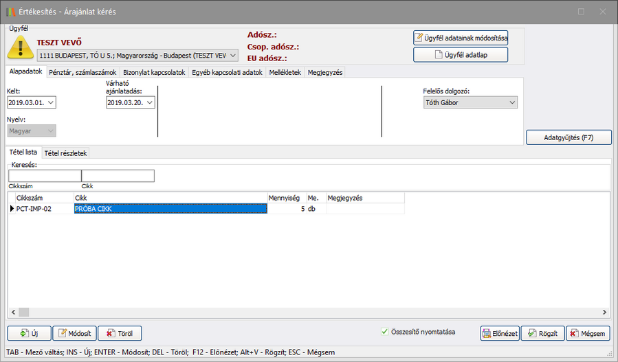 - Ha megadott minden szükséges adatot a fenti fülek segítségével, következhet a tételek hozzáadása a bizonylathoz.