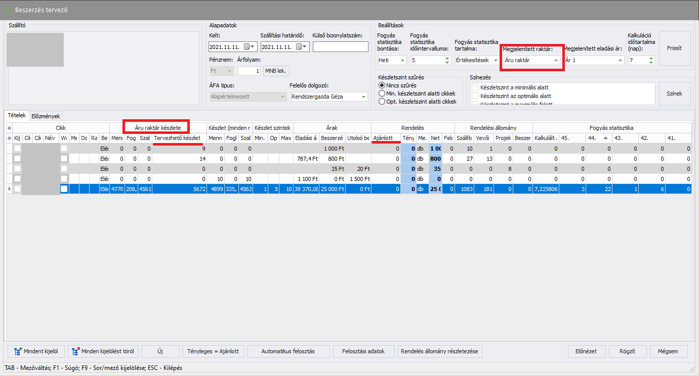 A Tényleges= Ajánlott gombbal a rendszer által kiszámolt, ajánlott mennyiséget másolhatjuk a ténylegesen rendelendő mennyiséghez.