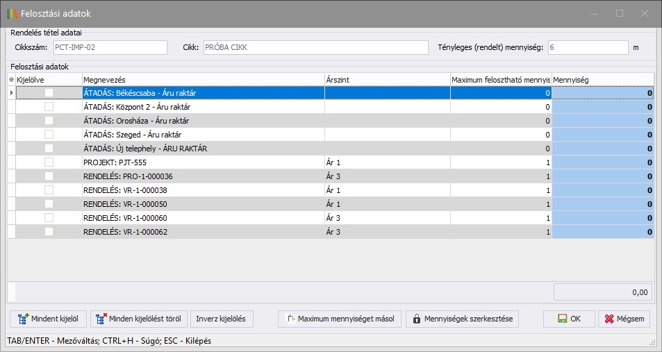 A Felosztási adatok gombbal oszthatja el a rendelendő mennyiséget a vevői rendelések, projektek között.
