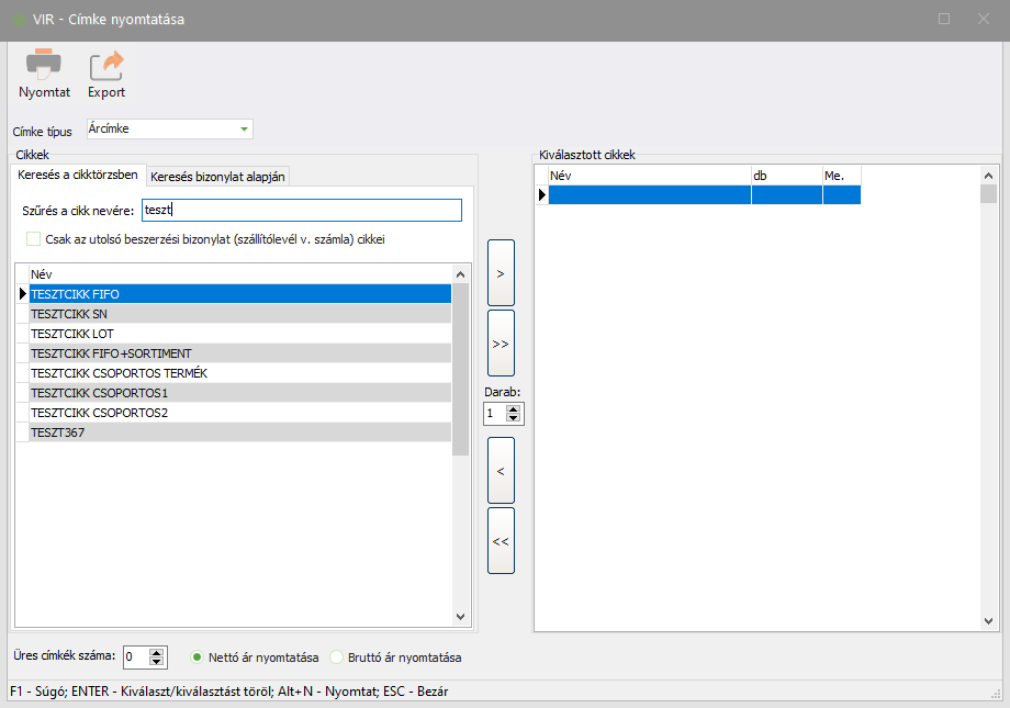 mező segítségével, hány darab címkét kíván nyomtatni! A cikk a Kiválasztott cikkek listájába mozgatható vagy két gyors egymás utáni bal egérgombos kattintással vagy az erre szolgáló gomb segítségével.