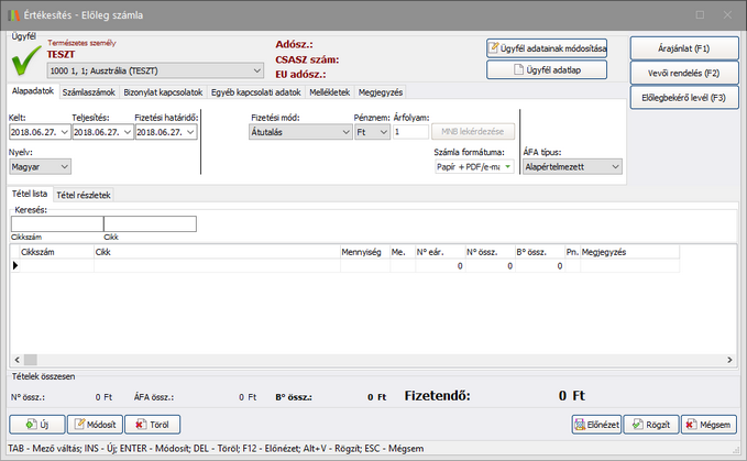 Új Előleg számla rögzítéséhez válassza az Értékesítés -> Előleg számla menüpontot!