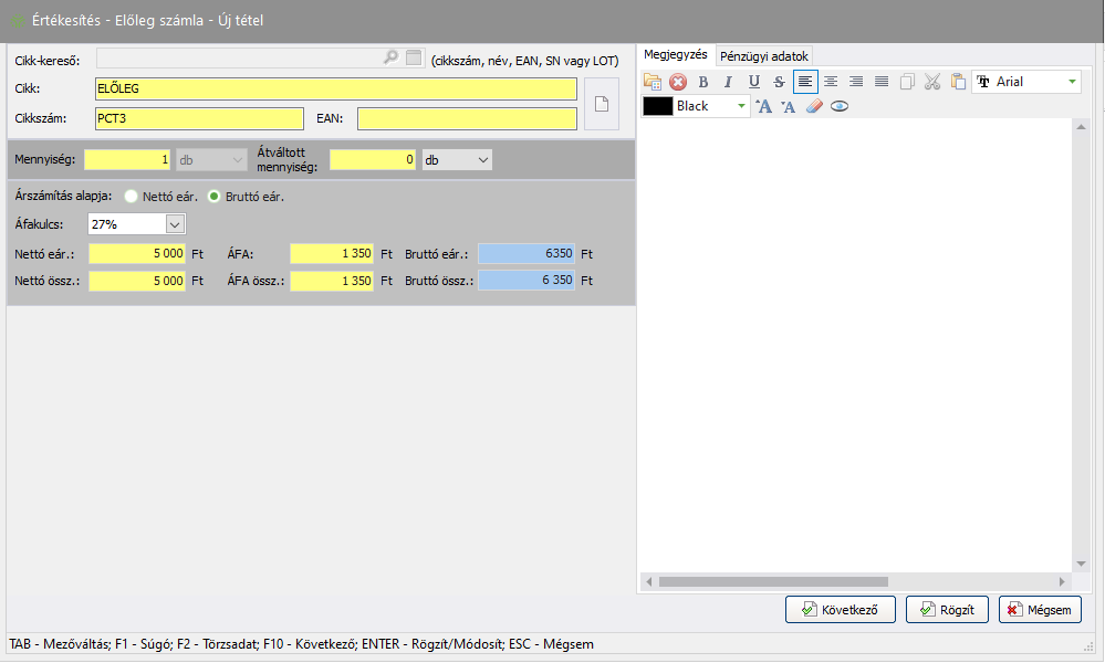 mezőbe a cikkhez (előleghez) tartozó megjegyzést.