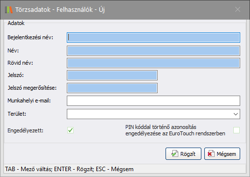 - Bejelentkezési név: A rendszerbe történő bejelentkezéskor a felhasználót azonosító adat. Egyedi adat, azaz egy bejelentkezési név csak egyszer szerepelhet.