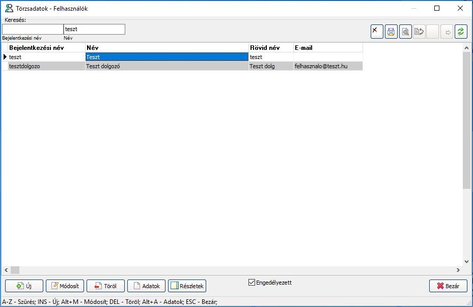 Egy, a rendszerben már rögzített felhasználó adatainak megtekintéséhez válassza ki (egy kattintással a megfelelő sorra) a felhasználót, majd nyomja meg az alsó gombsoron az