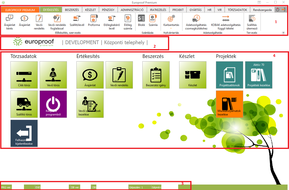 - A bejelentkezett felhasználó és a telephely: A főképernyőn látható, hogy az adott számítógépen melyik felhasználó mely telephelyre jelentkezett be. Itt található az Europroof logója, melyre kattintva az Europroof Premium honlapja nyílik meg egy új böngészőablakban.