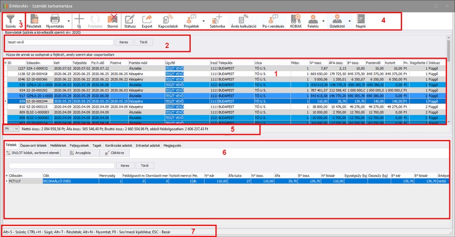 - Felső menüsor: Ebben a részben található a Részletek gomb, amelyre rákattintva a listában kijelölt elem részletei megjelenik alul a 6-os részben. Az itt látható gombok egyes karbatartóban eltérőek lehetnek, pl egyes ablakokban megtalálható a Stornó, más ablakban a Töröl gomb.