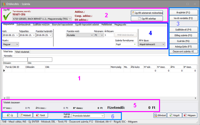 A bizonylatkészítő ablakok 6 jellemző egysége: