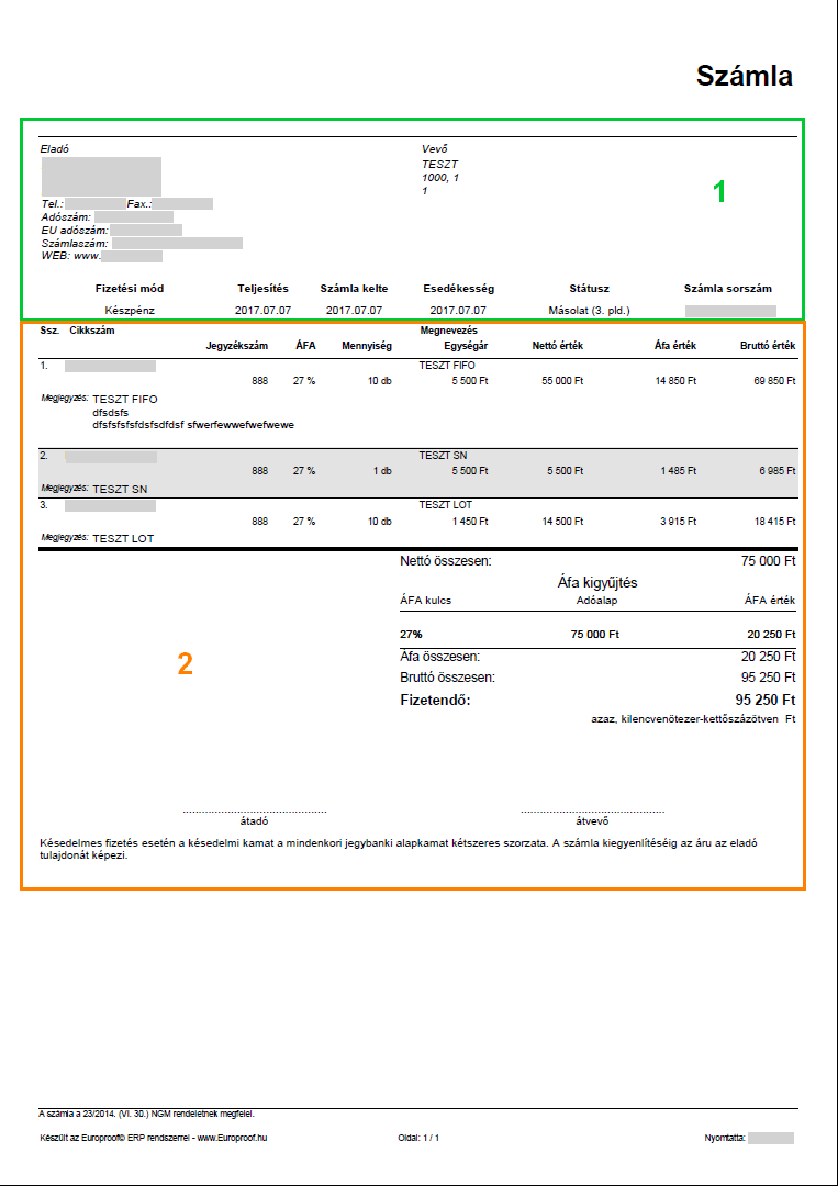 A fej (1) tartalmazza az ügyfelek adatait, a számlaszámot és a számlázással-fizetéssel kapcsolatos információkat. A törzs (2) tartalmazza az elemek (jellemzően cikkek) egyenkénti adatait, mint például egységár, cikkszám, továbbá a törzs tartalmazza a végösszeget és a forgalmi adó információit. A törzs alatt találhatók az ügyfelek aláírásainak fenntartott mezők.