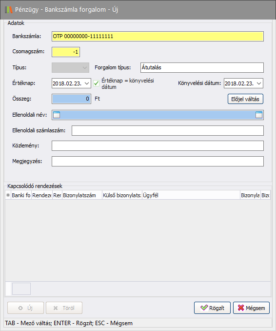 (Új): Új bankszámla forgalom kézi rögzítése.