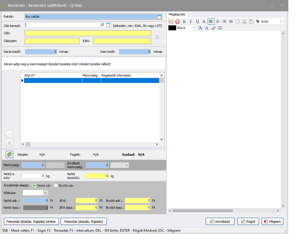 17. Amennyiben LOT kódos, vagy egyedi SN kódos termék beszerzését rögzíti, úgy a program a Mennyiség: