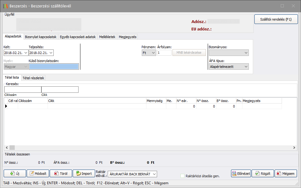 - Ezután a beszerzési bizonylaton megjelennek az importált tételek, és a bizonylatrögzítés a megszokott módon folytatódhat.