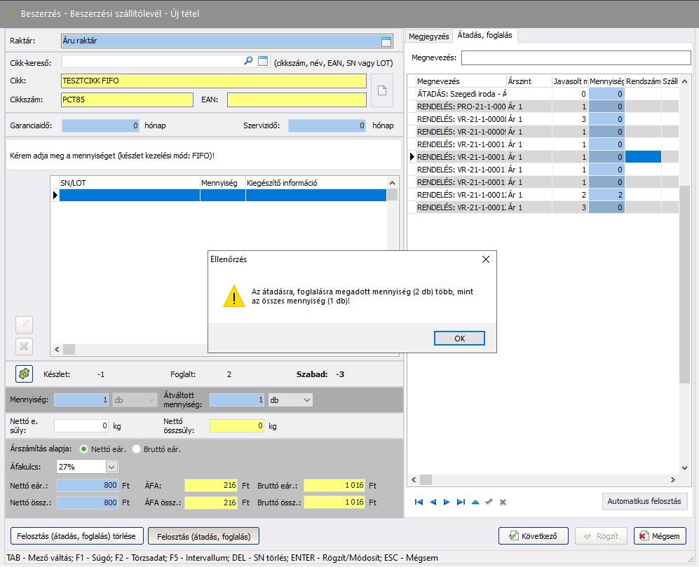 (Felosztás (átadás, foglalás)) gombra. Ekkor a jobb oldali ablakrészben a Megjegyzés mellett megjelenik az Átadás, foglalás fül is, ahol a tétel összmennyisége felosztható. A felosztás lehetséges raktárak között, Vevői rendelés és Proforma bizonylatok, továbbá Projektek és Feladatok között. A lista tartalma változik a kiválasztott cikk függvényében. Vagyis ha a kiválasztott cikk nem szerepel egyetlen rendelésen sem és egytelen projektben/feladatban sem lett anyagigényként hozzáadva "Rendelt" státusszal, akkor csak az aktuális telephely (ahová a felhasználó be van jelentkezve) raktárai láthatók. A felosztásnál látható Árszint oszlopban akkor vannak adatok, ha a projekt anyagfelhasználásra rögzítev lett az adott cikkből. Valamint a szállítói rendelés kelt oszlopa abban az esetben tartalmaz dátumot, ha a projekt anyagrendelés funkcióval szállítói rendelés lett rögzítve az adott cikkre, mely előzményként van felhasználva a beszerzési bizonylaton.