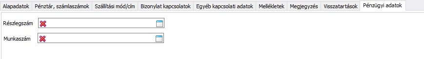 A Pénzügyi adatok fülön adhat a bizonylathoz részlegszámot és/vagy munkaszámot, mely adatokat a törzs megnyitása után választhat ki.