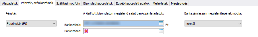 mezőben adja meg az első bankszámlaszámot, ami megjelenik a kiállított számlán. Ezt előzőleg a Bankszámla törzsben rögzíteni kell. (Bővebben a Bankszámla törzs c. fejezetben) - Bankszámla: