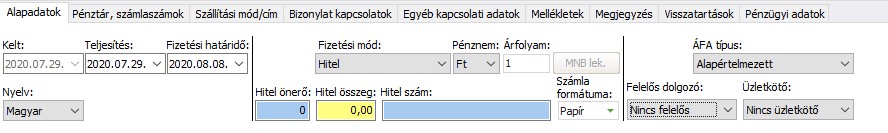 Itt kerülnek bemutatásra a bizonylatkészítés során a bizonylatok fej részében található fülek, melyeken kötelező és hasznos adatokat rögzíthet a bizonylathoz.
