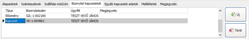 A Bizonylat kapcsolatok fülön kapcsolhatók egyéb bizonylatok a számlához.