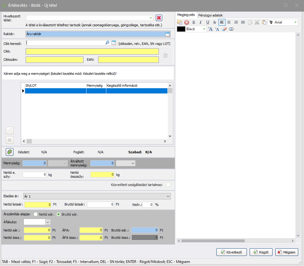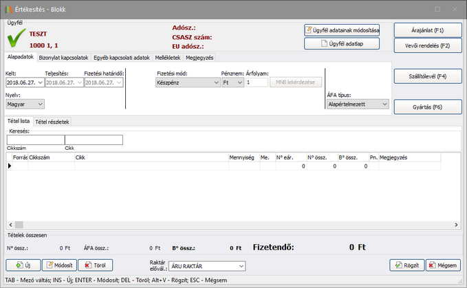 mezőben válassza ki azt a Raktárat, amelyet használni szeretne a bizonylatkészítés során! Minden tételnél egyenként megadható, hogy melyik Raktárból legyen lefoglalva / értékesítve, ez a választás mindössze a tételek felvételi adatlapján levő raktárválasztó alapértelmezését állítja be. - Ha szeretné rögzíteni a blokkot, kattintson a