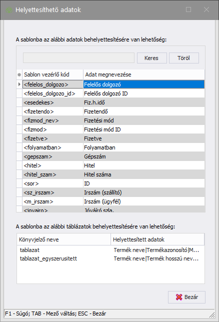 Az információs ablakban egy listában kereshetően szerepelnek a használható vezérlő kódok és mellettük az adat elnevezése, amit a rendszer behelyettesít a használata esetén. A vezérlőkódok a listából a CTRL-C billentyű kombinációval vágólapra másolhatók és a sablonba a megfelelő helyre beilleszthetők. Egy vezérlő kód többször is szerepelhet a sablonban, a funkció minden előfordulás helyére elvégzi a behelyettesítést. A behelyettesített szöveg azzal a formázással, betűtípussal fog szerepelni a végleges dokumentumban, mint amivel a sablonban a vezérlő szöveg szerepelt.