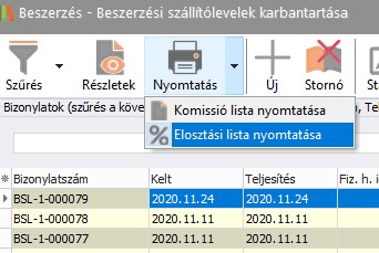 A Beszerzési szállítólevelek és Beszerzési számlák karbantartása menüpontból érhető el. A nyomtatási listában kiválasztva az elosztási adatok nyomtathatók ki a kiválasztott bizonylat vonatkozásában.
