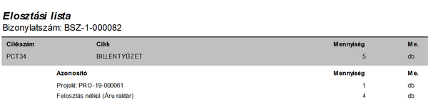 Egy bizonylat tételeinek telephelyekre felosztott mennyiségeinek nyomtatása. Segítségével könnyedén átlátható, hogy a kézhez kapott termékek közül mely tételekből mekkora mennyiség kerüljön át az egyes telephelyekre.