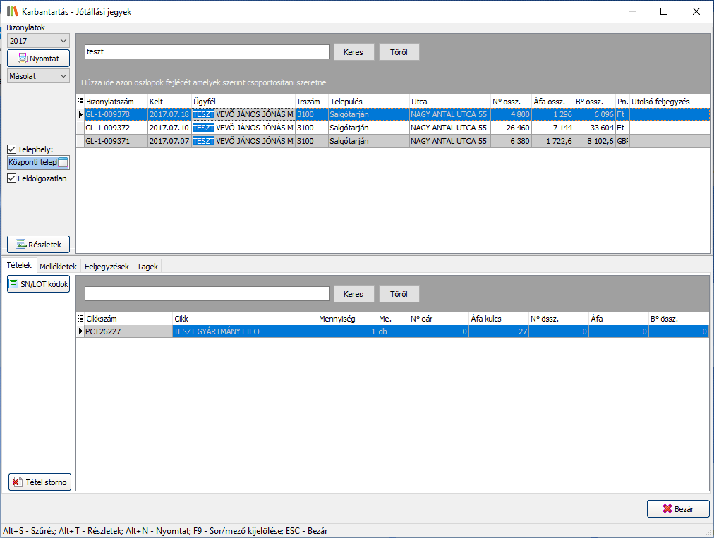 1. Bizonylatfej és bizonylattörzs: A jótállási jegy változó információit tartalmazza, többek között a kibocsátó cég és ügyfél adatait, a keltezést, tételeket és a garanciák időhosszát. Ezek az adatok az értékesítési bizonylat bizonylattörzséből automatikusan töltődnek ki, a listára tételeket kézzel fel- és arról levenni nem lehetséges.