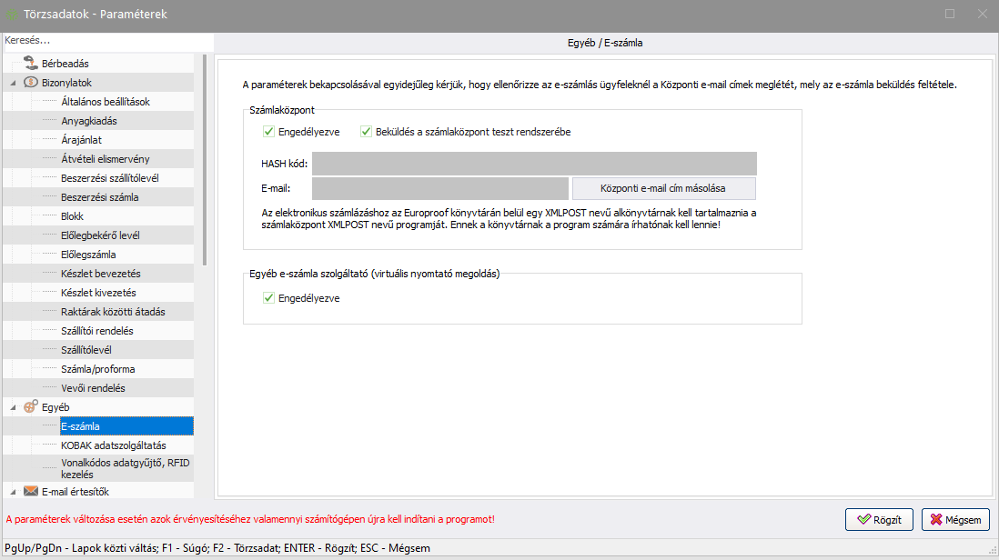 Amennyiben a Számlaközpont paraméter engedélyezett állapotú, úgy a HASH kód megadása kötelező. Az elektronikus számlázáshoz az Europroof könyvtárán belül egy XMLPOST nevű alkönyvtárnak tartalmaznia kell a számlaközpont XMLPOST nevű programját. A könyvtárnak írhatónak kell lennie az Europroof program számára.
