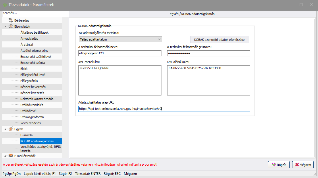 - A technikai felhasználóhoz tartozó adatok (felhasználói név, jelszó, privát kulcs (XML cserekulcs), publikus kulcs (XML aláírókulcs)) pontos megadása nélkülözhetetlen az adatszolgáltatás teljesítéséhez!