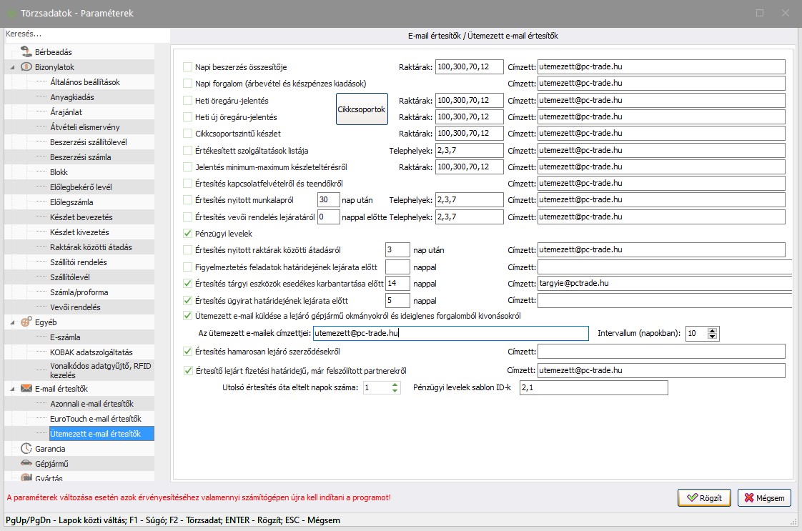Elérése: Törzsadatok -> Paraméterek -> E-mail értesítők (fül) -> Azonnali e-mail értesítők (fül) vagy