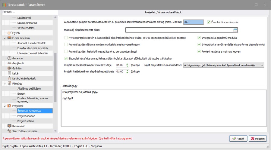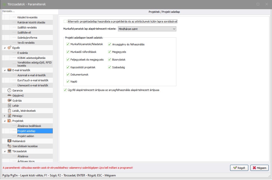 Elérése: Törzsadatok -> Paraméterek -> Projektek (fül)
