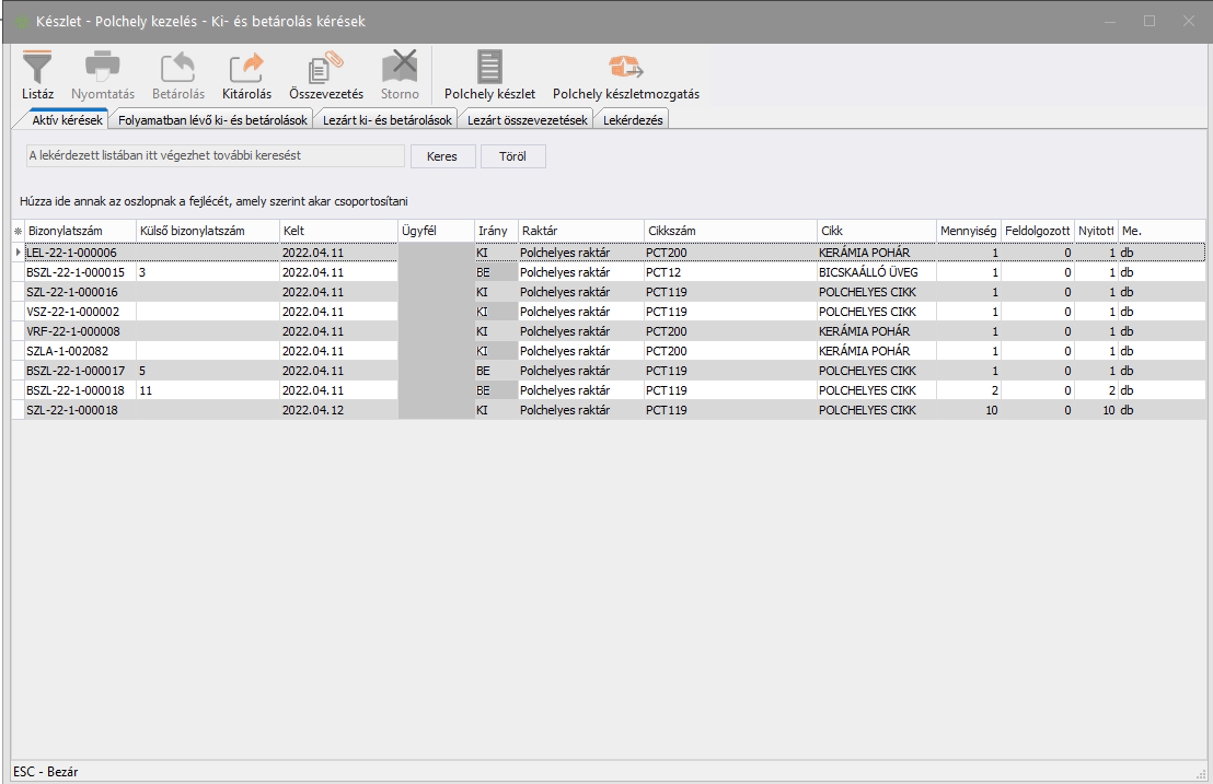 A listában megjelenő kérések ki- és betárolásokkal rendelhetők össze az egyes bizonylatoknak megfelelő