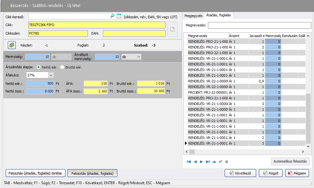 (Felosztás) gombra. Ekkor a jobb oldali ablakrészben a Megjegyzés mellett megjelenik az Átadás, foglalás fül is, ahol a tétel összmennyisége felosztható a telephelyek, projektek és vevői rendelések között. Amennyiben a szétosztott mennyiség nem egyezik meg az összmennyiséggel, erre a program figyelmeztet. Az Automatikus felosztás gombbal. - Ha mégsem szeretné a tételt felosztani, kattintson a Felosztás (átadás, foglalás) törlése gombra.