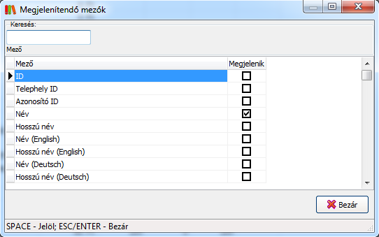 A listán az adott törzsben elérhető összes adatmező neve megjelenik, mindegyik mellett egy-egy jelölőnégyzet. A jelölőnégyzetekkel állítható be, hogy a hozzá tartozó mező látható legyen-e a szűrt listában, vagy se. Az adatmezők között név szerint keresni is lehet, ami nagyszámú adatmező esetén megkönnyíti a feladatot. A kereséshez kezdje begépelni az adott mező nevét, és a program visszaadja a begépelt szöveget tartalmazó mezőket. (Szótöredékre is ad találatot)