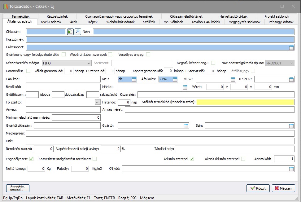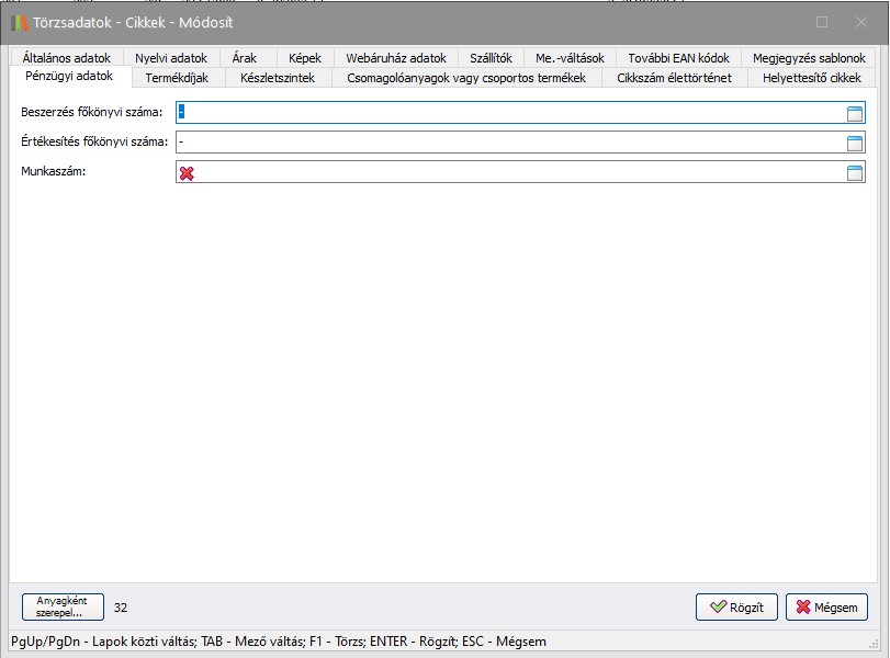 Munkaszám: Itt adható meg a cikkhez tartozó munkaszám. Ezt az értéket a rendszer továbbviszi pl bizonylatkészítéskor a bizonylat tételéhez, de ez az adat módosítható a bizonylatkészítéskor és azt követően is a karbantartó ablakban.