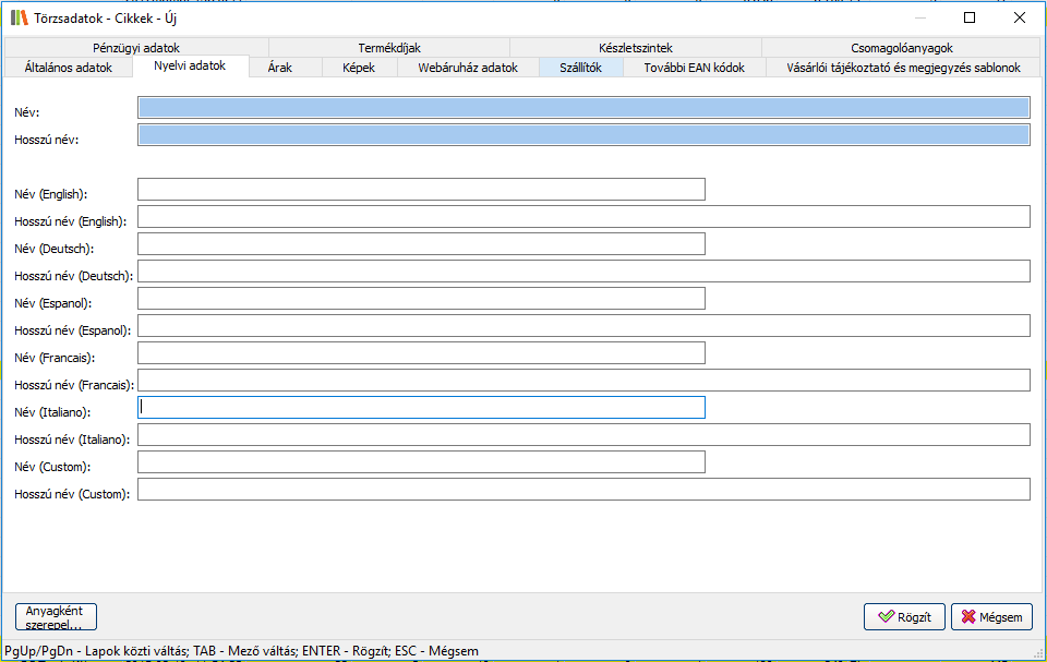 - A Nyelvi adatok fülön szükség esetén írja be a megfelelő idegen nyelvű kifejezéseket. A cikk magyar nyelvű neve és hosszú neve az Általános adatok fülön kötelezően megadottal megegyező lesz, automatikusan kitöltődik.