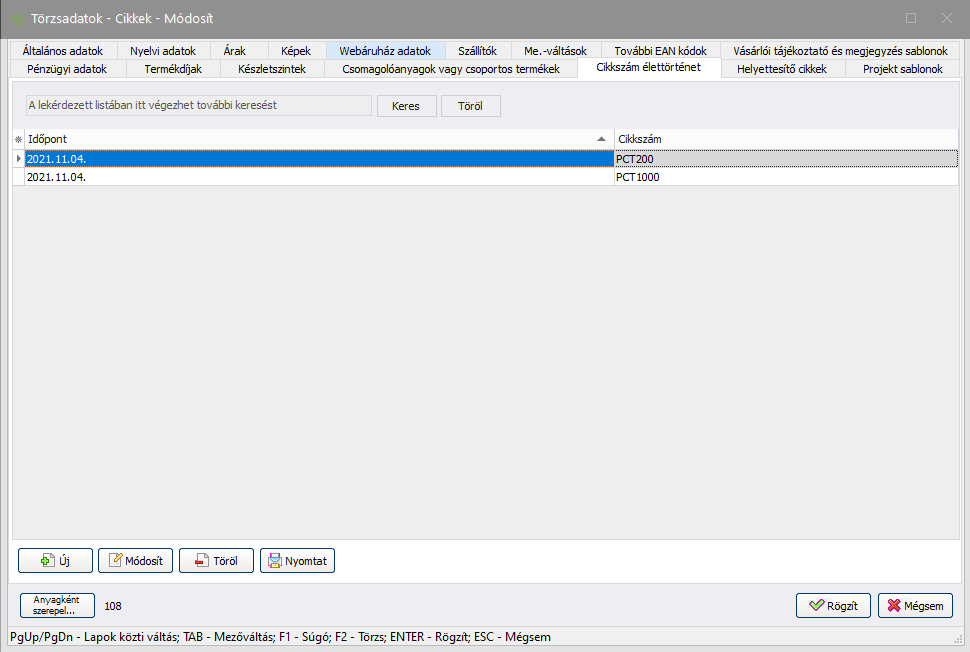 Ezen a fülön rögzítheti és követheti az egyes cikkekhez tartozó cikkszámok élettörténetét. A rendszer automatikusan tölti az élettörténetet rögzítéskor, ha a cikkszám módosult az "Általános adatok" fülön. A felhasználónak lehetősége van manuálisan is változtatni az élettörténeten az Új, Módosít és Töröl funkciók segítségével.